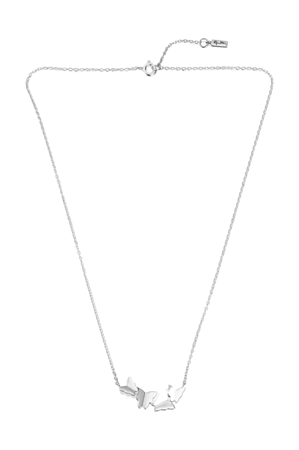 Sterlinghopeisessa kaulakorussa on perhosparven muotoinen riipus. Kaikki korumme valmistetaan kierrätetystä kullasta, valkokullasta ja hopeasta.