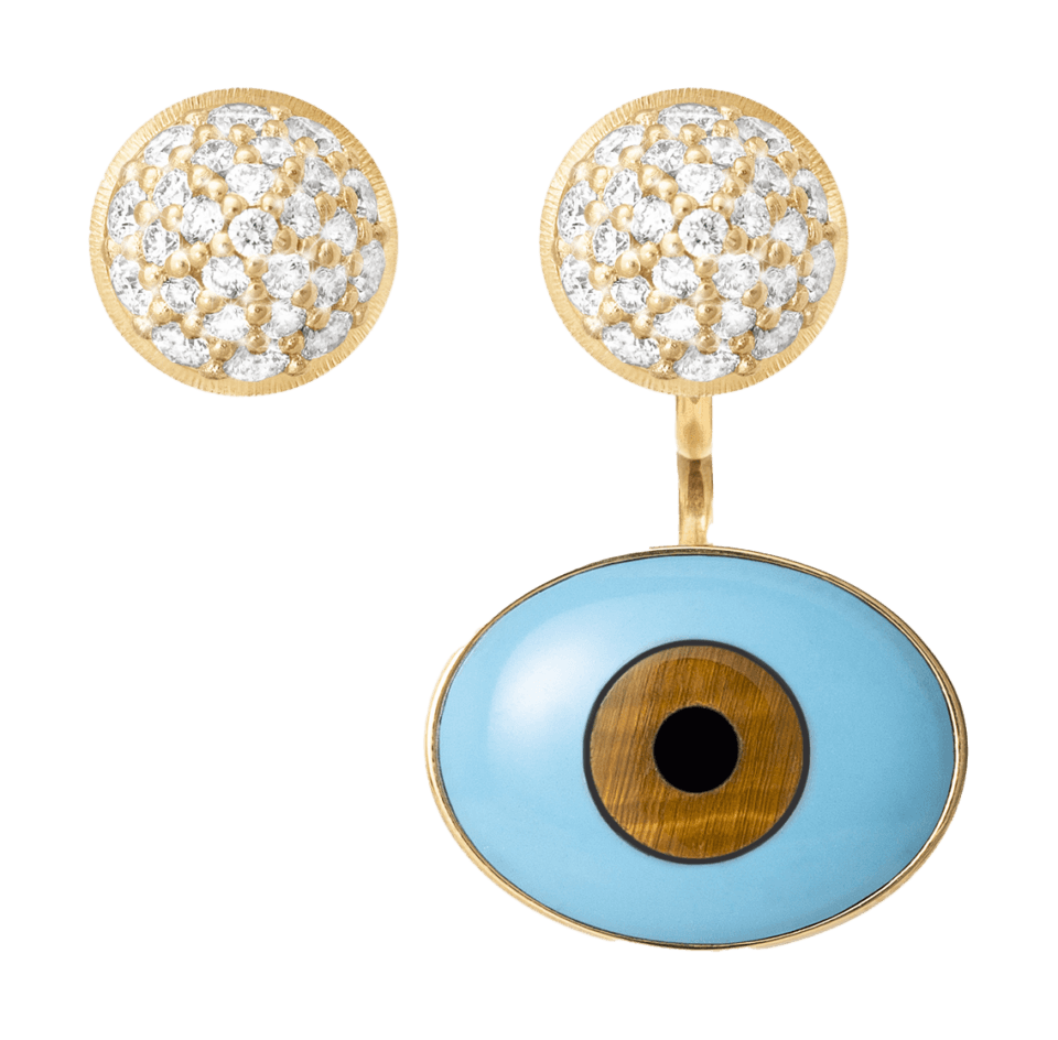 Lotus -korvakorut 750 keltakullassa. Timanttien yhteispaino 0,39ct Top wesselton/VS. Korvakorujen ilmettä voi helposti muuttaa lisäämällä niihin eri osia. Evil Eye riipus A9996-485 ostettavissa erikseen.