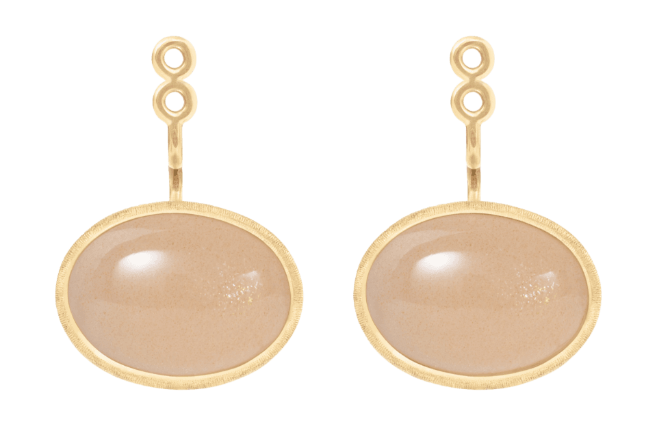 Charlotte Lynggaardin suunnittelemat Lotus-korvakorujen riipukset on valmistettu 18 karaatin keltakullasta, ja niissä on vaaleanpunaiset kuukivet. Näkyvät kultapinnat ovat kultaseppien käsin satinoimat. Sopii käytettäväksi nappikorvakorujen kanssa. Takana lisäsilmukat koukullisten riipusten ripustamiseen. Myydään pareittain. Osa Lotus-kokoelmaa.
