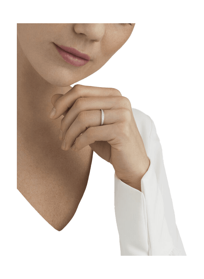 Sormus on kauniisti muotoiltu 18 karaatin valkokullasta, jossa on briljantti-hiotut timantit.