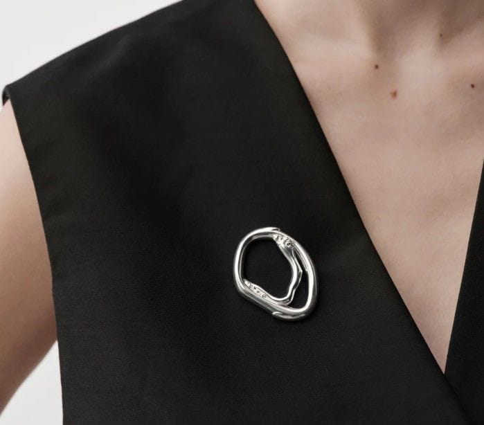 Veistoksellinen Männyt-rintakoru on valettu täysin kierrätetystä hopeasta. Korun muoto on orgaaninen ja pehmeästi aaltoileva. Kiiltävän hopeapinnan ja rosoisten yksityiskohtien vuoropuhelu luo Männyt-rintakoruun houkuttelevan jännitteen. Korun nurja puoli on ontto. Teräsneula.