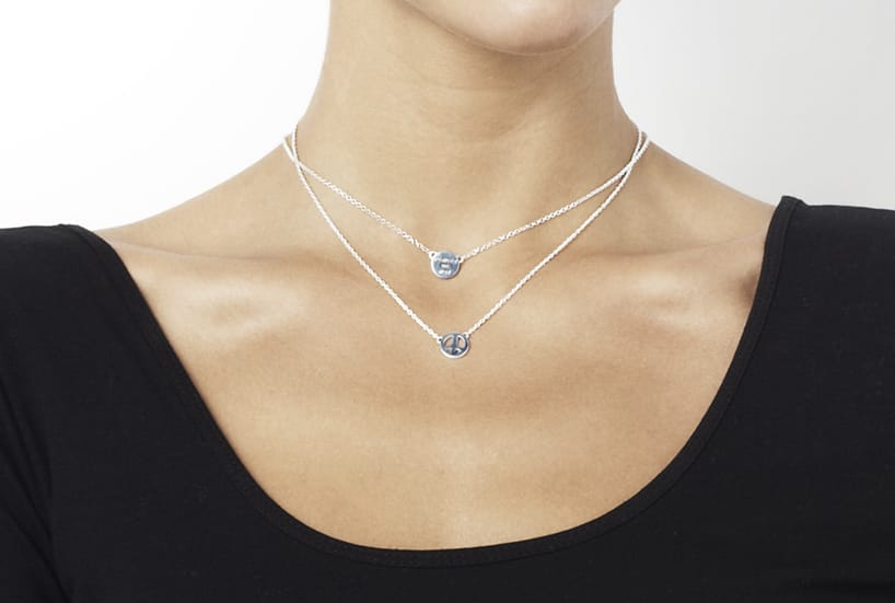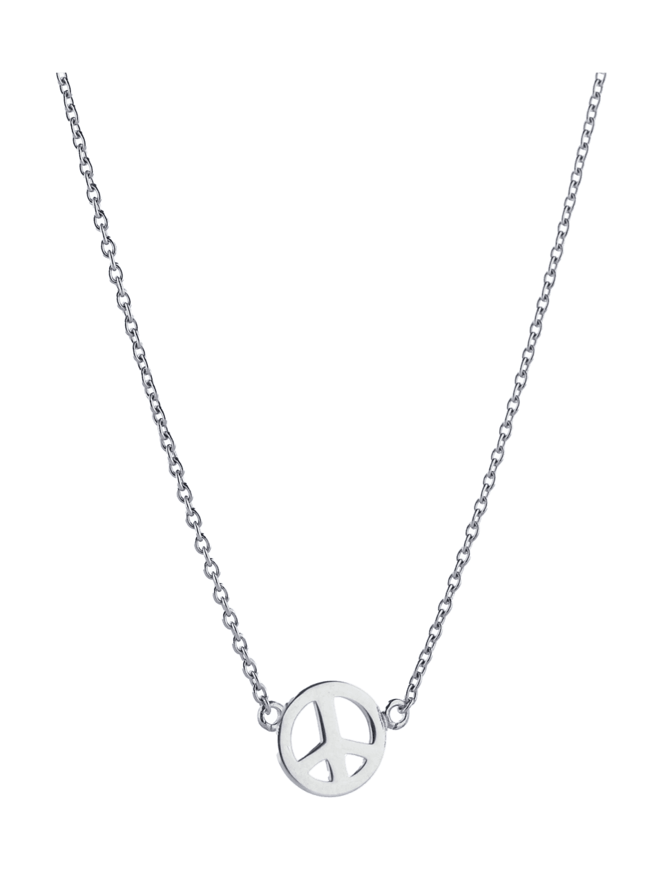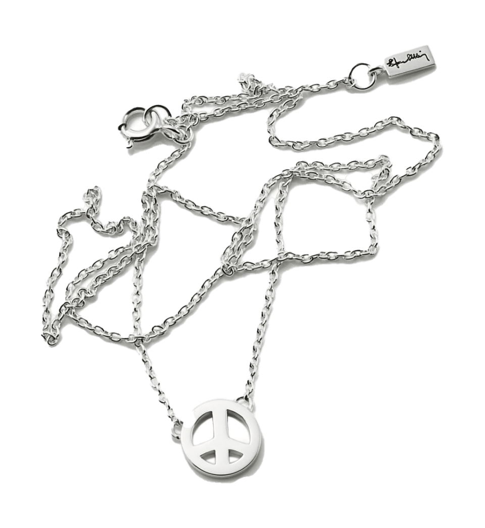 Sterlinghopeisessa kaulakorussa on pieni rauhansymboli. Kaikki korumme valmistetaan kierrätetystä kullasta, valkokullasta ja hopeasta.
