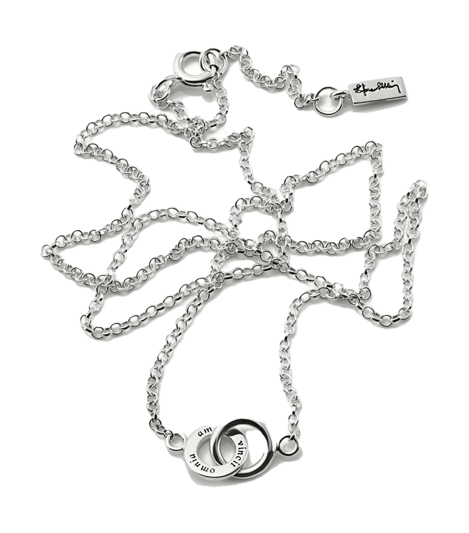 Kaulakoru, jossa on kaksi toisiinsa linkittynyttä rengasta. Sterlinghopeaa. Yksi pyöristetty rengas, toinen neliskulmainen, johon on kirjoitettu latinankieliset sanat ”Amor Vincit Omnia” – ”rakkaus voittaa kaiken”. Kaikki korumme valmistetaan kierrätetystä kullasta, valkokullasta ja hopeasta.
