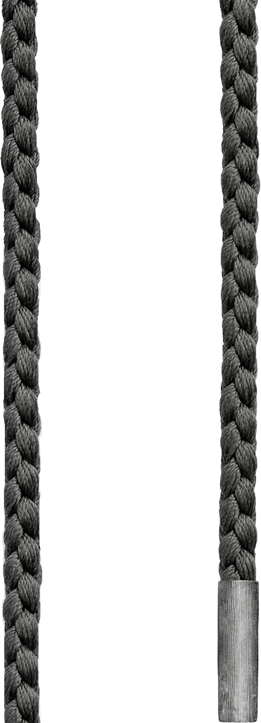 Punottu, harmaa Mokuba silkkinauha hopeisilla päätypaloilla. Nauhan kokonaispituus 130cm.
