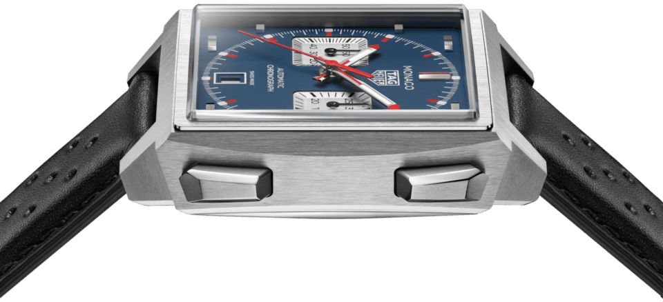 Musta, rei’itetty vasikannahkaranneke on kunnianosoitus vintage-kauden Heuer Monacolle, ja se on ranteessa miellyttävän tuntuinen. Luokan 5 titaanista valmistettu, kaksoisturvapainikkeilla varustettu perhoslukko varmistaa istuvuuden ja korostaa kestävyyden ja hienostuneisuuden tasapainoa.