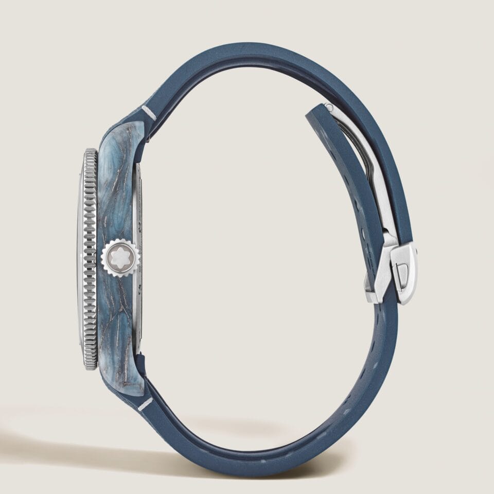 Kokonaisuuden viimeistelee sinivihreä vaihdettava kumiranneke, joka kapenee solkea kohti ja sisältää tarkan hienosäädön käyttömukavuuden varmistamiseksi.