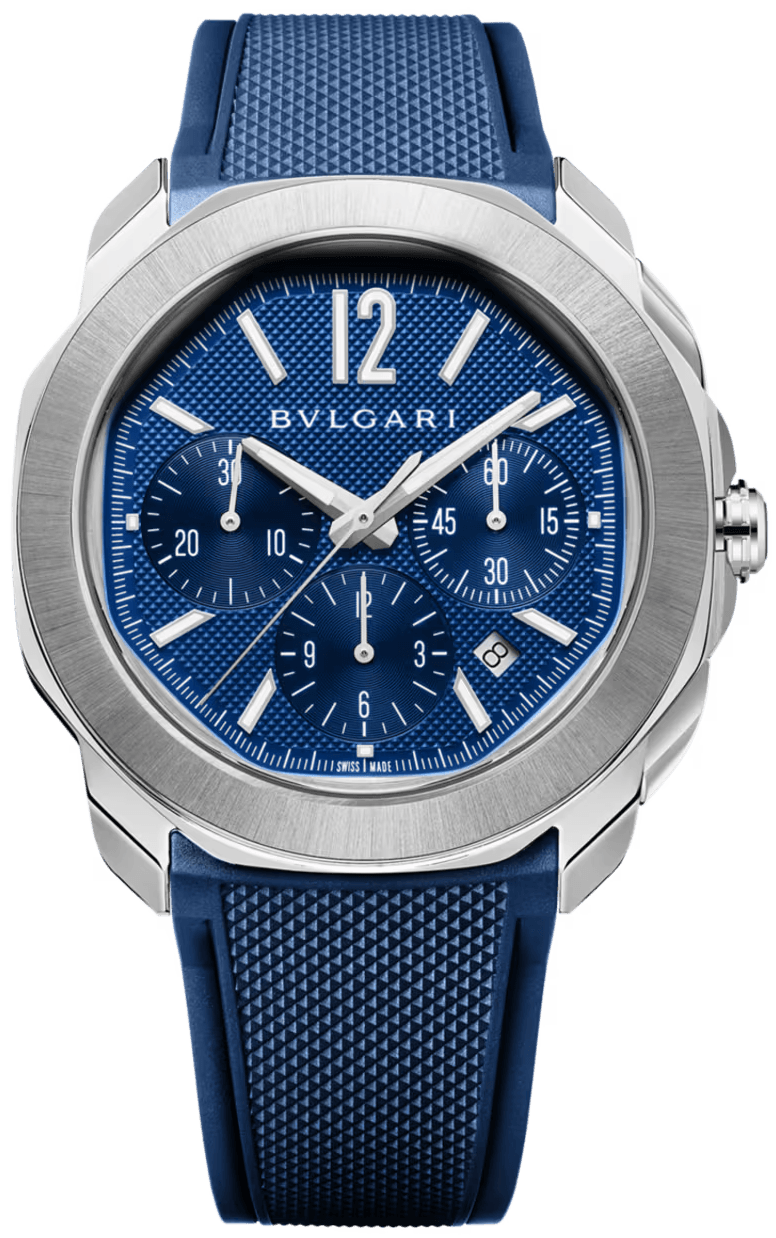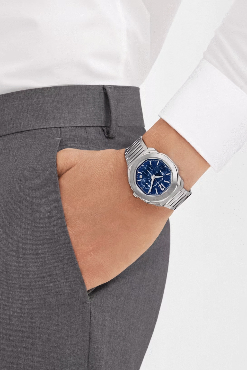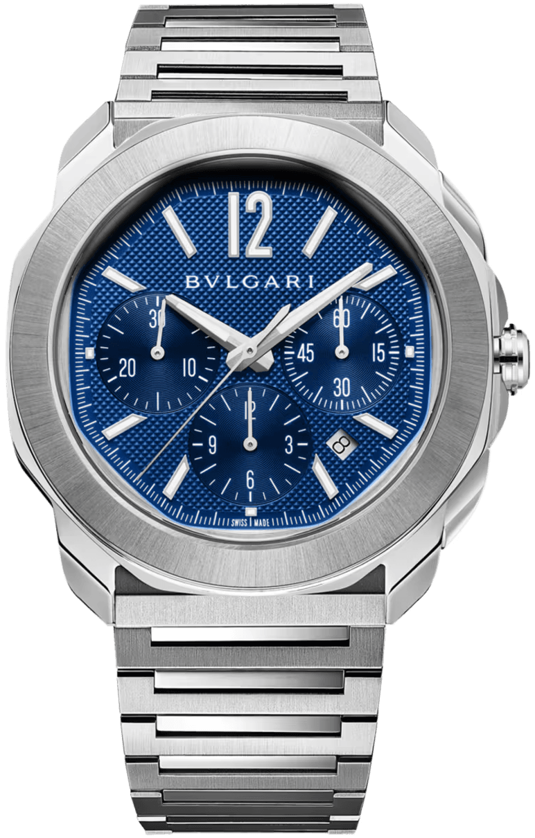 Bvlgari yhdistää roomalaisen perinteen, italialaisen estetiikan ja sveitsiläisen kellosepäntaidon ainutlaatuisella tavalla Octo Roma Chronograph -mallissa. Kellon tunnusomainen, pyöreän ja kahdeksankulmaisen väliin sijoittuva kuori tekee siitä modernin muotoilun taidonnäytteen. Ruostumattomasta teräksestä valmistettu 42 millimetrin kuori, satiinihiottu ja kiillotettu viimeistely sekä vaihdettava teräsranneke tuovat tyylikkään, ajattoman ilmeen. Kellon sydämenä toimii Bvlgarin oma mekaaninen automaattikoneisto BVL399, joka tarjoaa 42 tunnin käyntivaran ja mahdollistaa ajanoton tarkasti ja luotettavasti. Syvänsininen Clous de Paris -kuvioitu taulu on sekä esteettinen että funktionaalinen, tehden kronografin toiminnoista selkeät ja helposti luettavat.