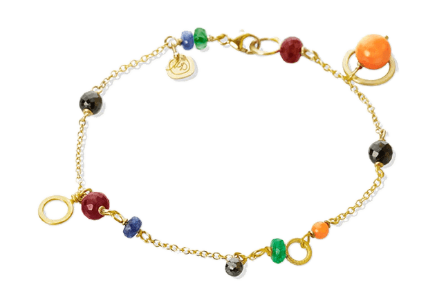 Piccolo Sunset -rannekoru roikkuu niin kevyesti ranteessasi, että et tunne, että käytät sitä. Rannekoru on herkkä ja hieno. Piccolo on tehty pienistä riipuksista ja elementeistä ilman teräviä reunoja, joten koru ei tartu vaatteisiin ja om mukava käyttää joka päivä. Tässä rannekorussa näkyy raikas ja viileä yhdistelmä helmiä: turkoosia, sitriiniä, labradoriittia ja safiiria.