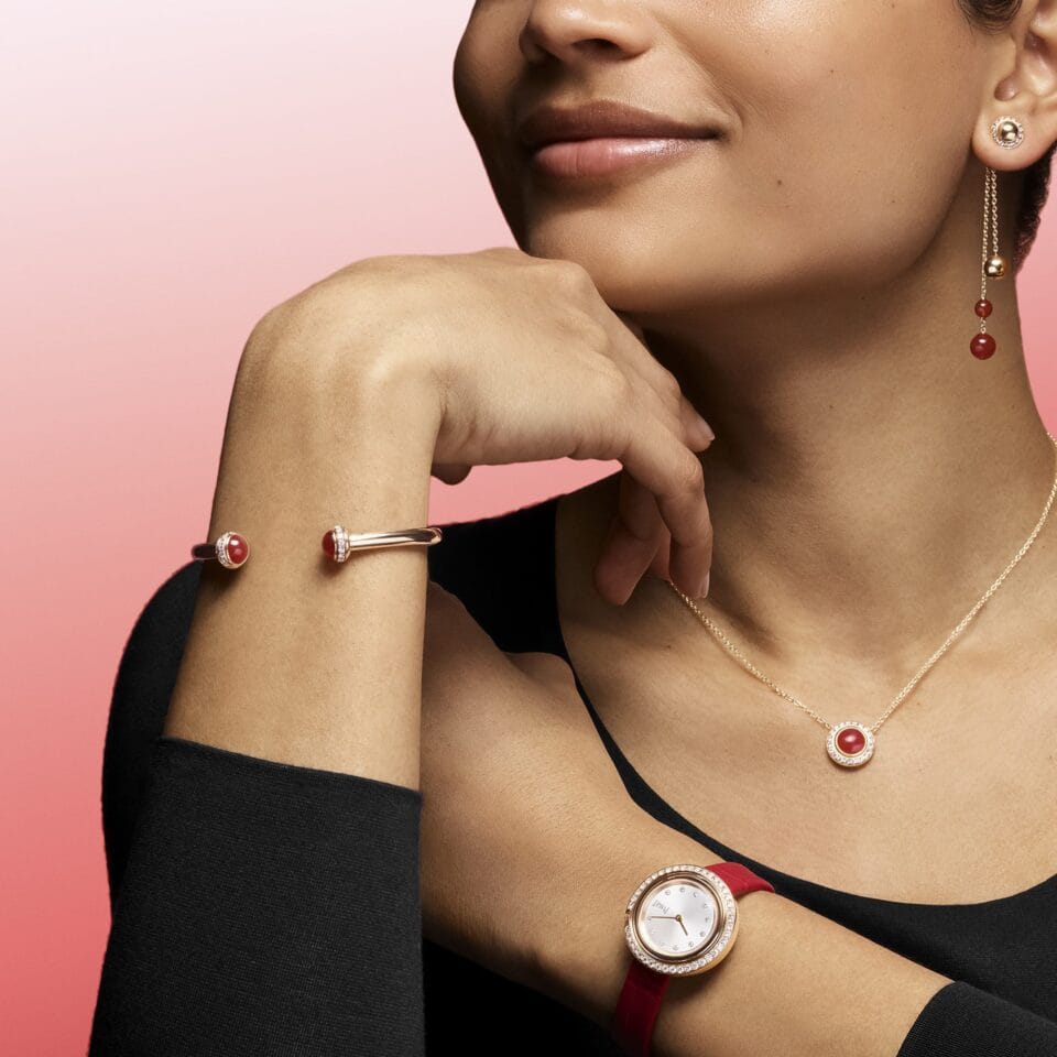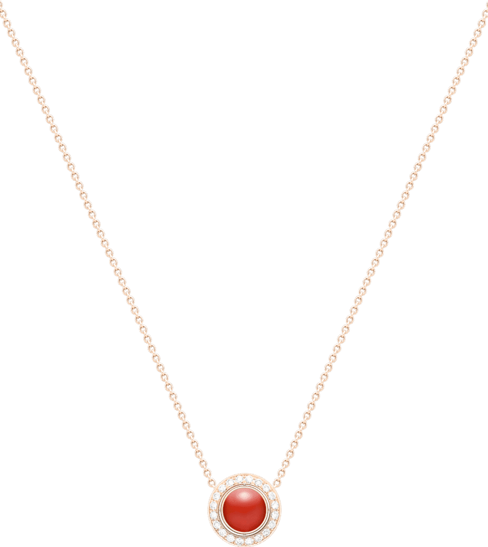 Possession riipus on valmistettu 18K ruusukullasta ja siihen on istutettu 20 briljantti-hiottua timanttia, yhteispainoltaan 0.28ct. Kaulakorua koristaa myös cabochon-hiottu karneoli, 0.82ct.