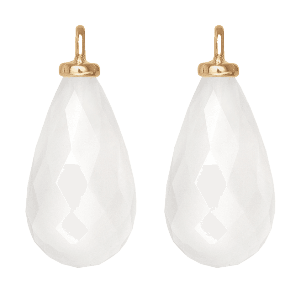 Charlotte Lynggaardin suunnittelemat korvakorujen riipukset on valmistettu 18 karaatin keltakullasta ja niissä on viistetyt, 12 x 7 mm:n maitovalkoiset kvartsi-cabochon-pisarat. Kultaseppien käsintekemät riipustipat on tehty ripustettavaksi korvakoruihin ja riipuksiin, joissa on silmukoita. Myydään pareittain. Osa Lotus-kokoelmaa.
