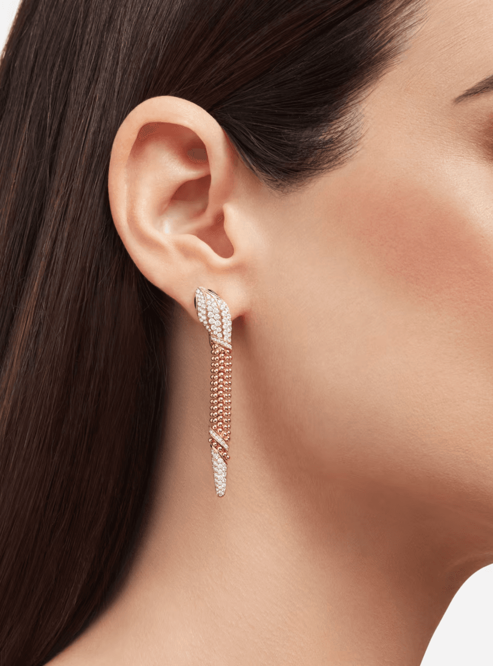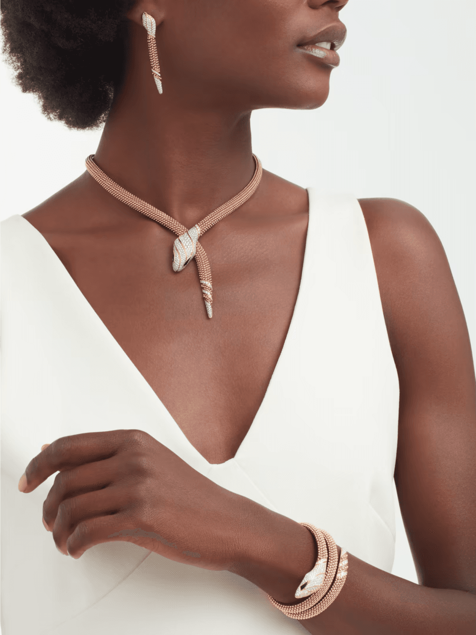18 karaatin ruusukullasta valmistetut Serpenti-korvakorut on koottu pienistä, liikkuvista kultaelementeistä, jotka antavat korulle elävyyttä ja kevyttä liikettä. Käärmeen lumoava pää ja häntä on koristeltu pavé-istutetuilla timanteilla. Kokonaisuudessa yhdistyvät korkeatasoinen käsityötaito ja korulle ominainen ajaton itsevarmuus.