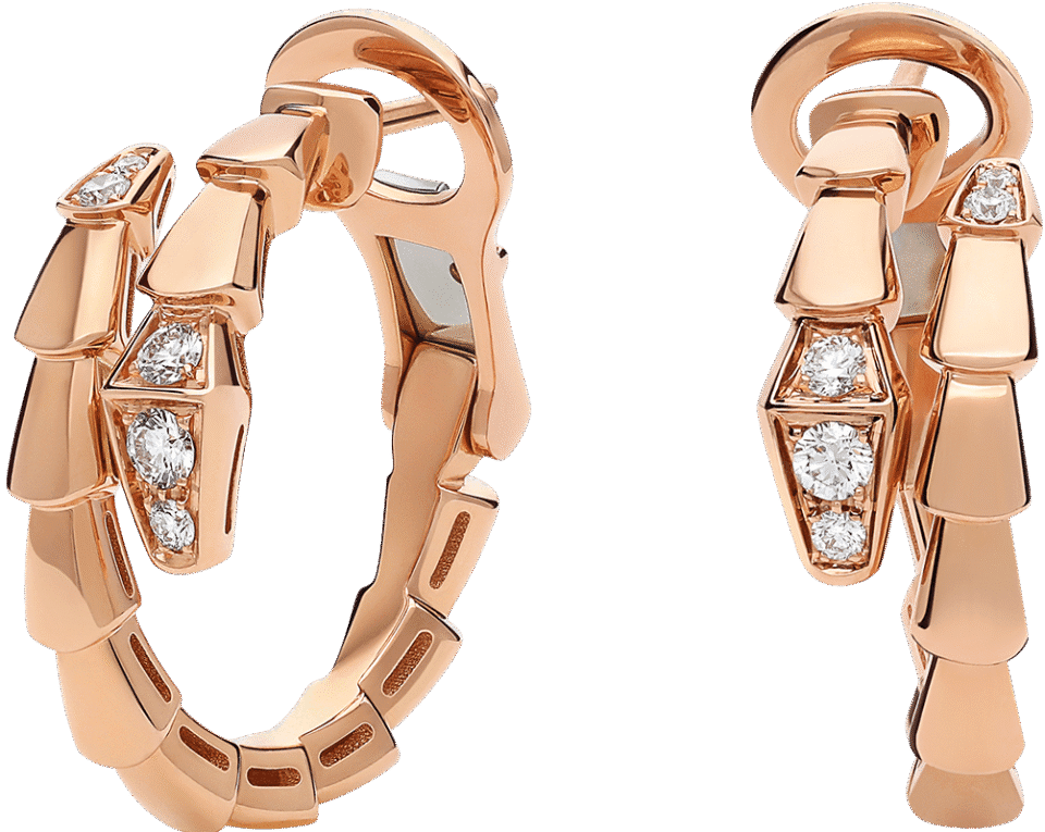 Bulgarin ikoninen Serpenti malli korvarenkaina. Materiaalina lämpimän auringon sävyinen punakulta, joissa loistaaa värittömät timantit.
