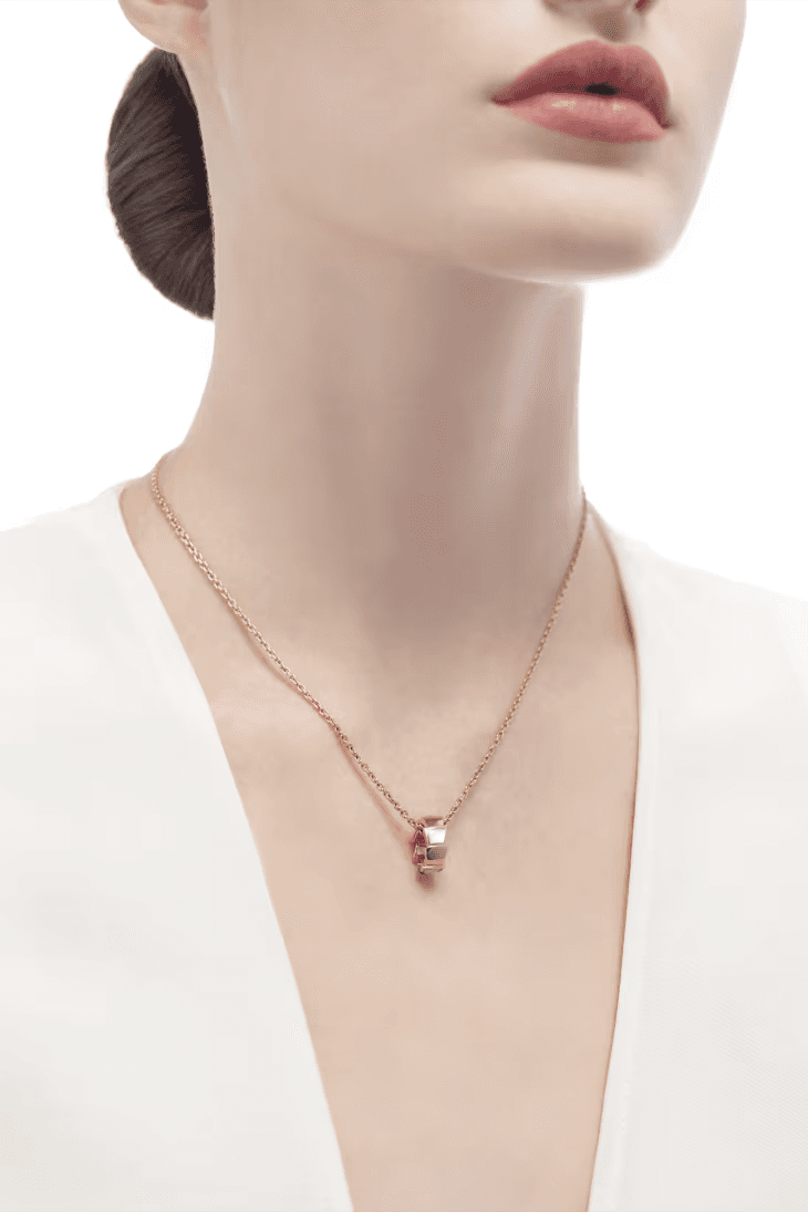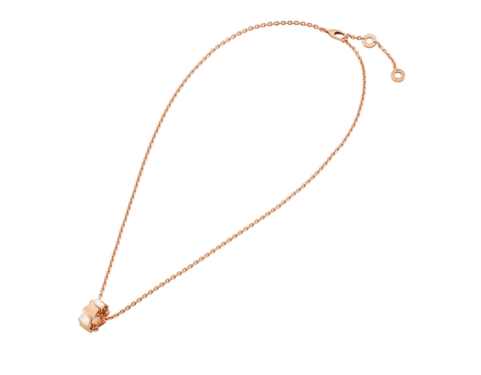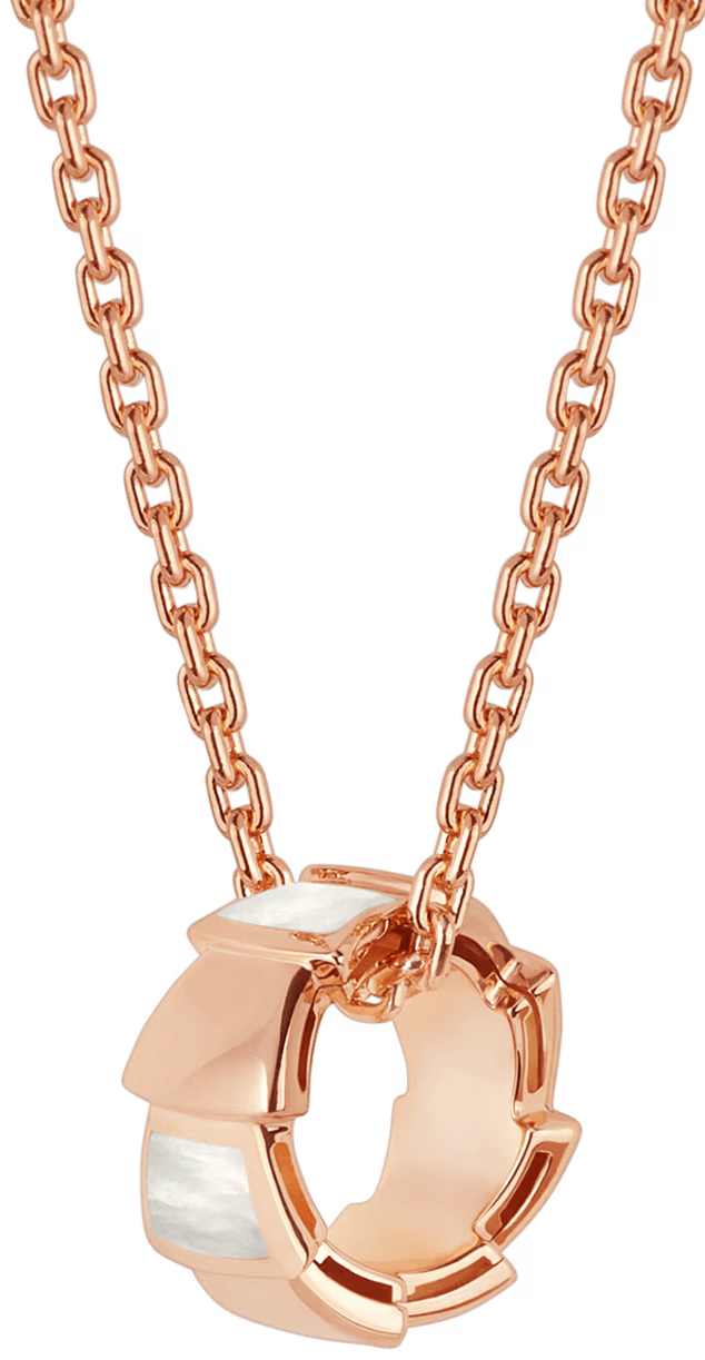 Kerällä olevan käärmeen inspiroima riipus on valmistettu 18 karaatin punakullasta ja sitä koristaa vaalean sävyinen helmiäinen.