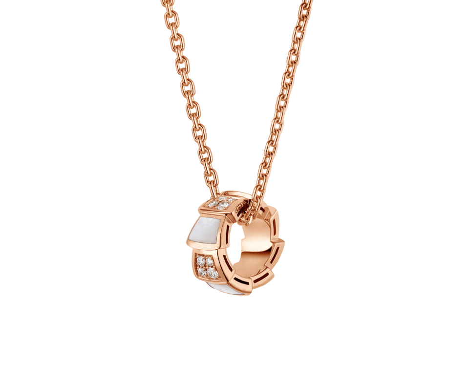 Serpenti Viper kaulakoru, 18K ruusukultaa jota koristaa valkoinen helmiäinen ja timantit.