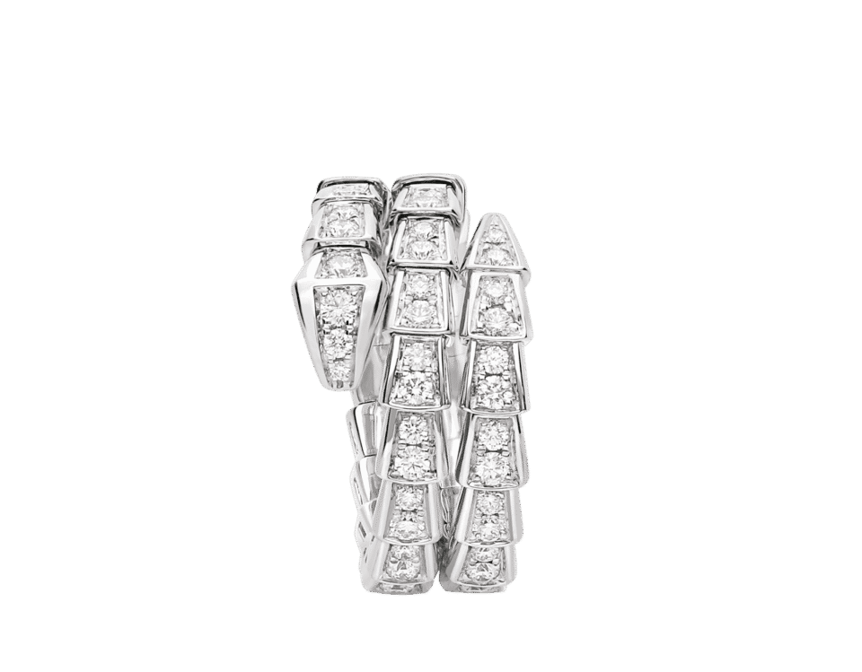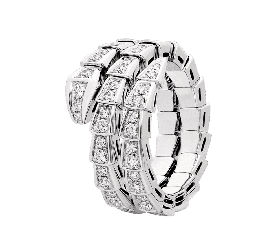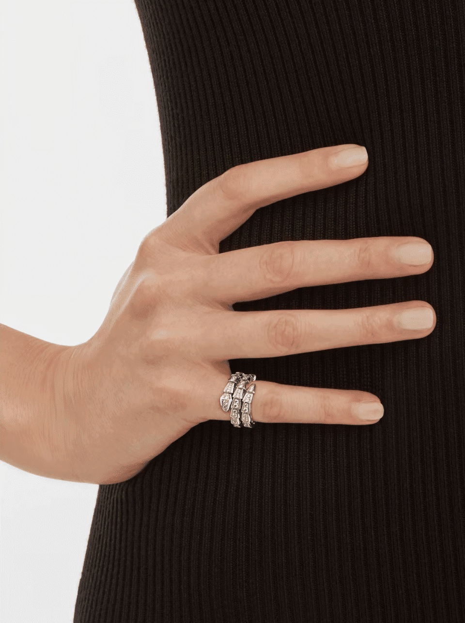 Serpenti Viper -sormus on valmistettu 18 karaatin valkokullasta ja kauttaaltaan timantein pavé-istutettu. Sormus yhdistää Bvlgarille tyypillisen puhtaan estetiikan, sulavat muodot ja karismaattisen ilmeen. Sormus tulkitsee ikonisella tavalla brändin loputtoman muutoksen symbolia. Myyttisen käärmeen voimaa ja jatkuvaa uudistumista heijastava koru rohkaisee suhtautumaan muutokseen voimavarana ja itsevarmuuden lähteenä. Helposti yhdisteltävä sormus tarjoaa rajattomasti stailausvaihtoehtoja ja huokuu kokoelman monipuolista, modernia henkeä.