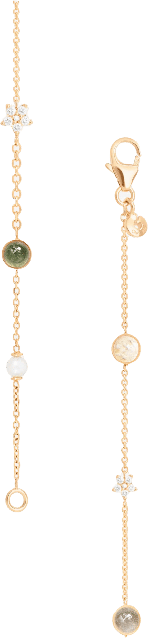 Shooting Stars rannekoru, 18K keltakultaa, ankkuriketju 30/40, makeanveden helmi, serpentiini, harmaa kuukivi ja rutiili, 2 tähteä, 12 timanttia yhteispainoltaan 0.10ct TW VS. Pituus 17cm.