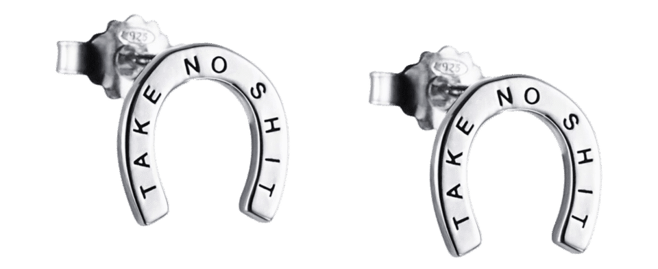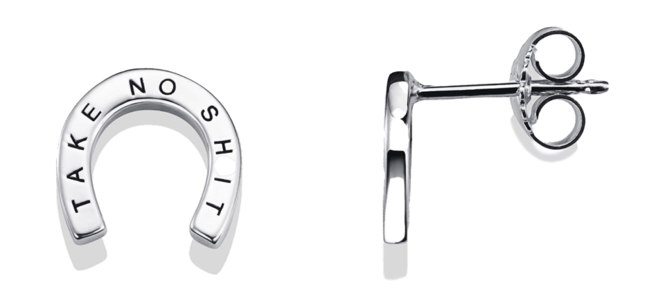 Hevosenkengän muotoiset sterlinghopeakorvakorut, joissa on Take No Shit -teksti. 100 SEK jokaisesta malliston myydystä korusta menee hyväntekeväisyysjärjestö BRISille. Järjestö tekee työtä lasten oikeuksien puolesta yhteiskunnassa. Kaikki korumme valmistetaan kierrätetystä kullasta, valkokullasta ja hopeasta.