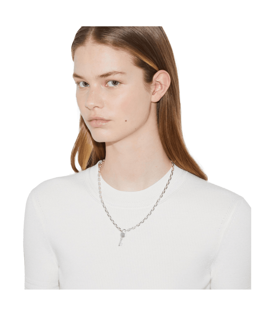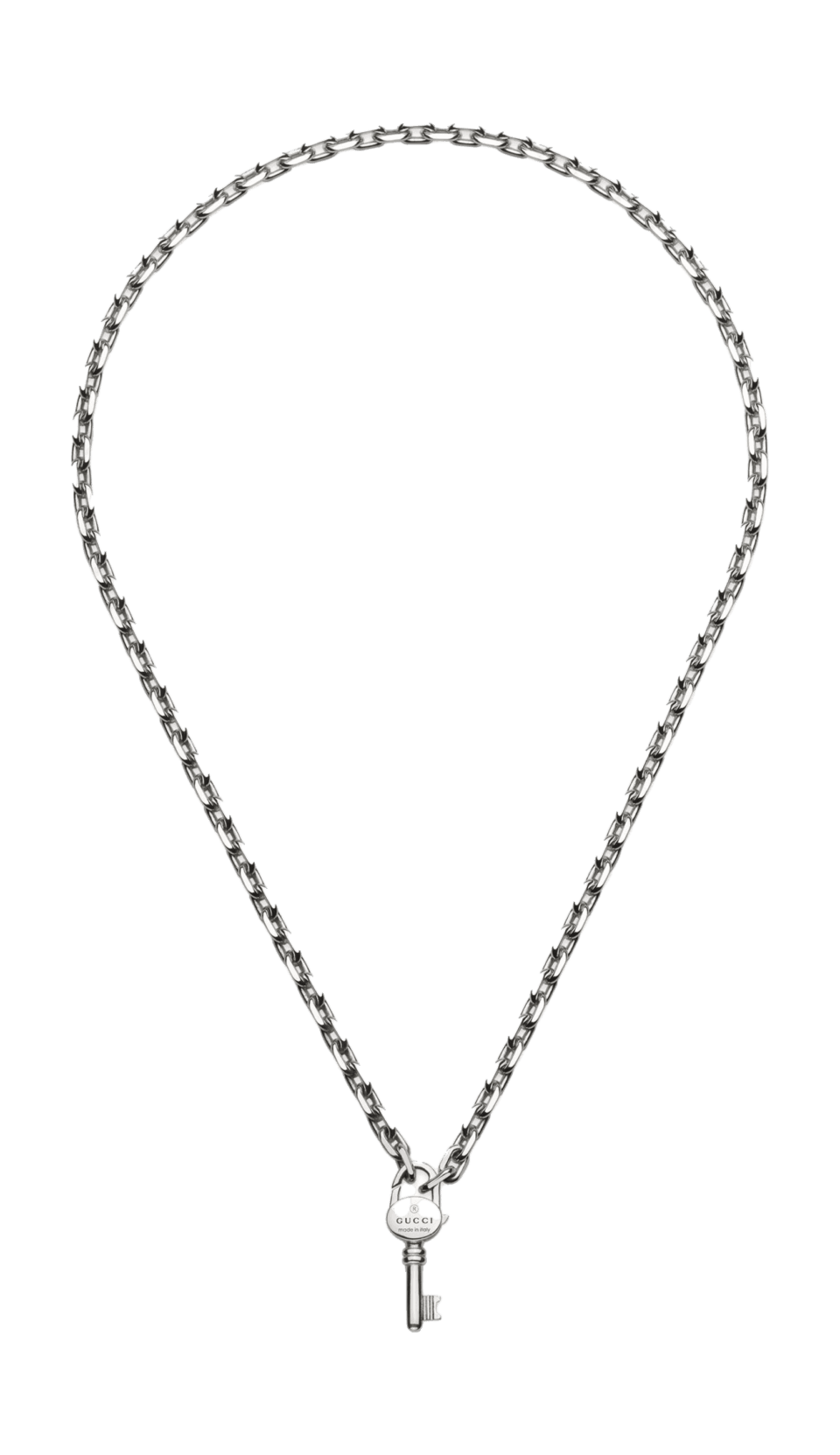 Guccin Trademark-mallisto yhdistää kuvioita ja kuusikulmaisia riipuksia muotitalon nimeen. Gucci Trademark -kaiverruksella varustettu avain viimeistelee tämän hopeisen ketjukaulakorun.