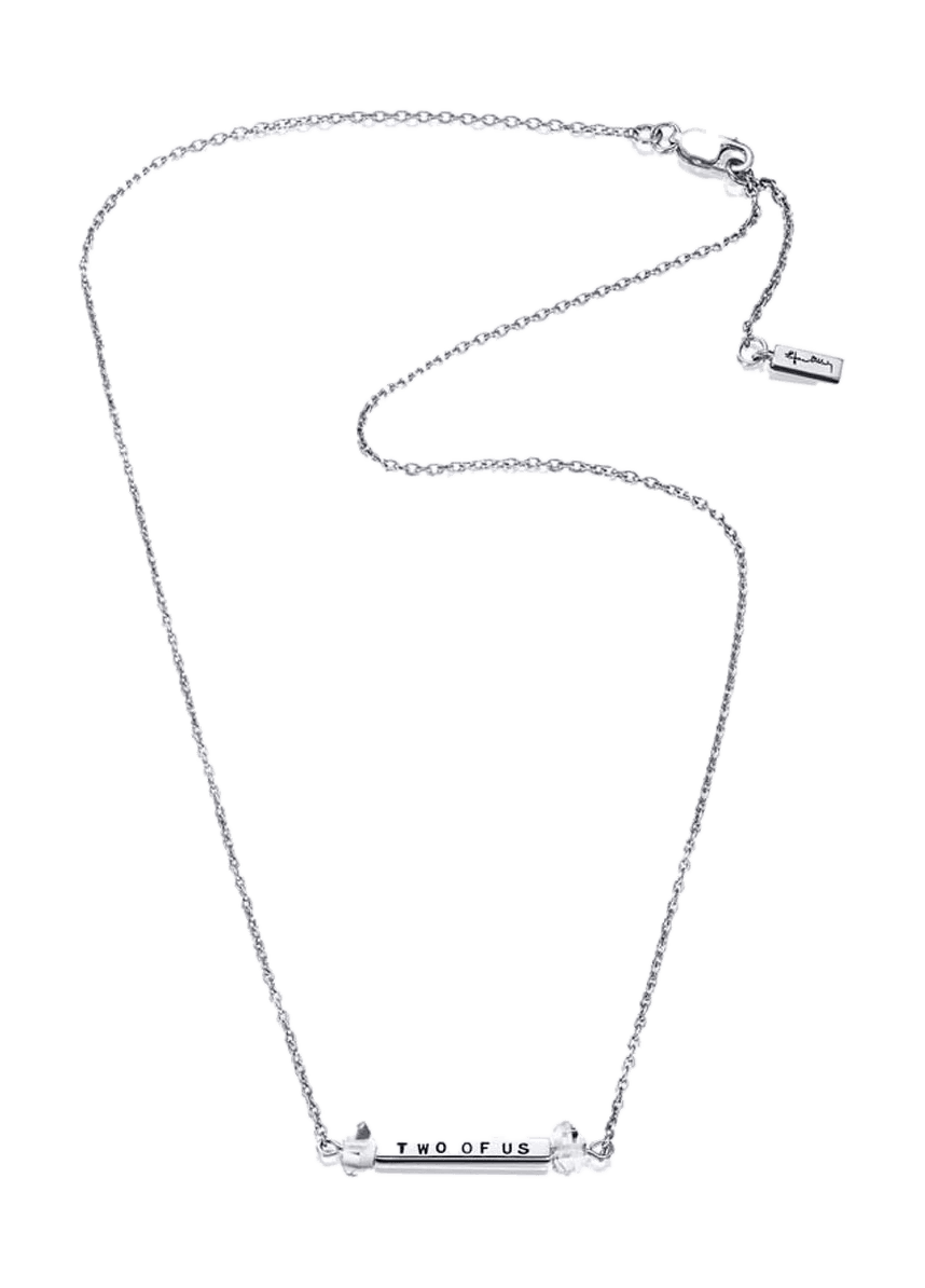 Tribuutti the Beatlesille. Kaulakoru hopeaa, laatta leimattuna tekstillä ”Two Of Us” Beatlesin kappaleen mukaan, Herkimer timantit molemissa päissä. Riipuksen koko 17.5 x 2.5 mm, ketjun pituus säädettävissä 42 – 45 cm. Koossa 40, pituus ei ole säädettävissä. Herkimer timantit 7.5 mm.