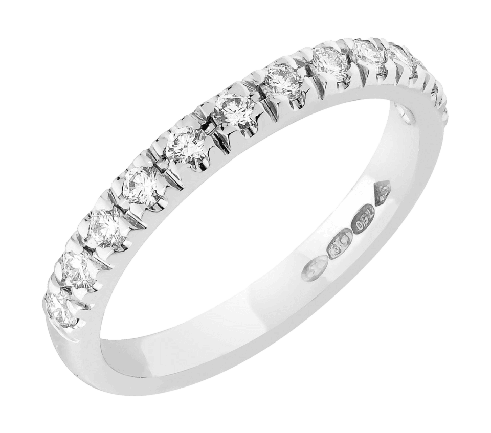 V-760w puoliallianssi / rivisormus on täydellisesti yhteensopiva Toivomuslähde-malliston halo-sormusten ja Aurinkotuuli-malliston V-455w ja V-460w sormusten vierelle. Timanttien istutus ja rivin pituus ovat samanlaiset kuin sivukivellisissä halosormuksissamme ja V-455w ja V-460w sormuksissa.