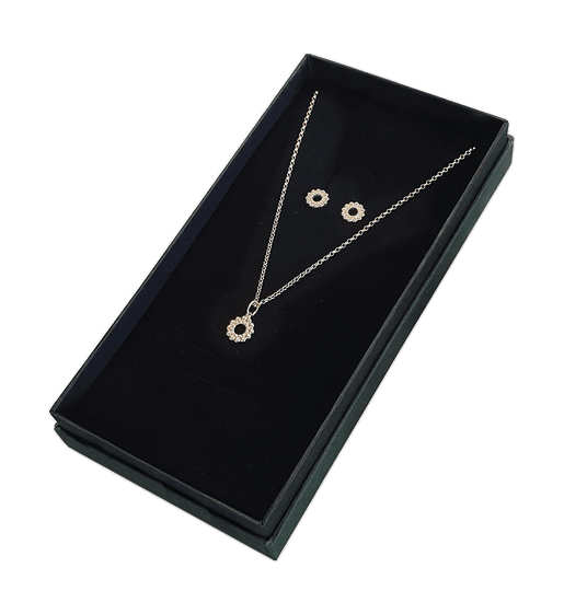 Valoisa-lahjapakkauksen pienet kultaiset Valoisa-korvakorut ja Valoisa-riipus loistavat kuin aurinko.