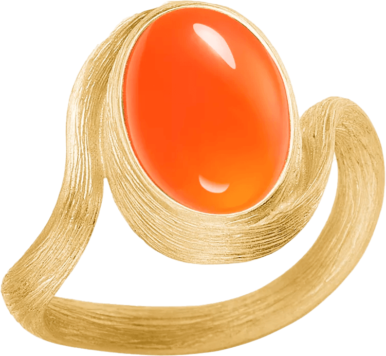 Vega sormus ilmentää klassista Dulong tyyliä. Mattapintaisen kullan liukuva muotoilu, yhdessä räiskyvän värisen karnelian kanssa, tuo sormukselle yllättävän ja lumoavan ilmeen.