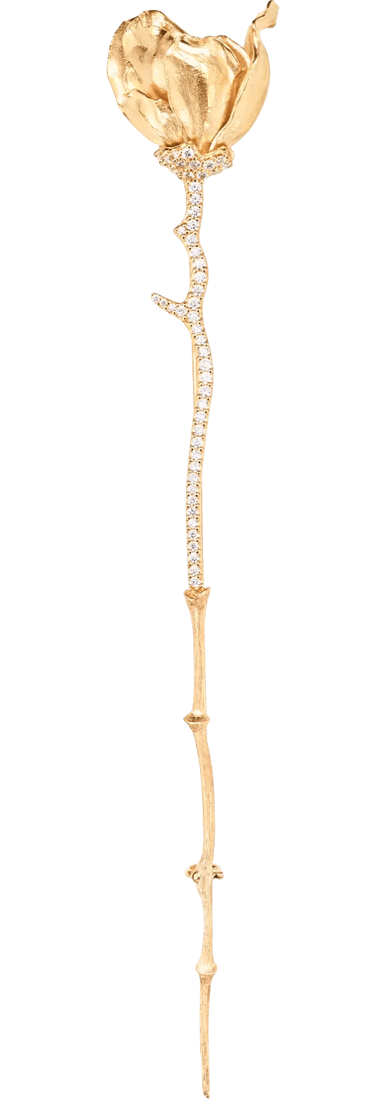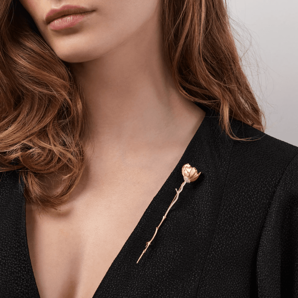 Charlotte Lynggaardin suunnittelema Wild Roses -rintaneula on valmistettu 18 karaatin keltakullasta ja siinä on 59 timanttia, yhteensä 0,42 ct TW VS. Rintaneulan pituus on 12 cm.